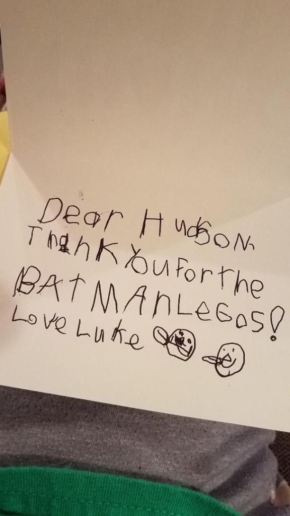 So, Amanda and LeAnn…please let your boys know that we didn’t forget them. We are grateful for their gifts and their friendship. Luke continues to really love the light sabers and the Legos. And in the future, while we will probably continue to approach thank-you notes with the best of intentions… Actually nope, scratch that. We will simply thank you in person for your lovely gift and for your friendship and call it a day. And my house will not burn to the ground.